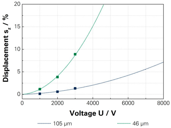 The investigation into the influence of thickness on the actuation displacement of the dielectric layer was investigated for 46 µm and 105 µm. The achieved actuation displacement showed a significant difference between the two DEAs, as shown in Figure 9. The reduction of the thickness can influence the electrical breakthrough, which is why the driving voltage has to be reduced to 3000 V. The determined driving voltage corresponds to an electric field of 71 kV/mm, which is still below the investigated dielectric strength for polymer electrodes of 84.6 kV/mm, and prevents the destruction of the actuator. Therefore, the actuation displacement of the DEA with 105 µm achieved 1.3% and the DEA with 46 µm achieved 8.9%. The actuation displacement for a driving voltage of 5000 V achieved 3.0% for the DEA with 105 µm thickness and 23.1% for the thinner DEA, based on extrapolation of the calculated characteristic curves, which are shown in Figures S18 and S19.