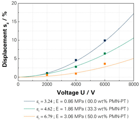 The influence of the relative permittivity on the actuation displacement was investigated for the PMN-PT modified basic raw polymer. The modification of the PDMS with the PMN-PT increased the relative permittivity but also the elastic modulus. The investigated DEAs achieved a relative permittivity of 3.24 (unmodified), 4.62 (33.3 wt %) and 6.79 (50.0 wt %). The main problem was that the elastic modulus increased faster than the relative permittivity by modification. Therefore, the actuation displacement was reduced. An additional counteracting effect from softening the dielectric layer was not investigated because the presented results based on softened DEAs with a curing agent ratio of 13:1. The achieved displacement with a driving voltage of 7000 V was 13.2% (3.24), 8.2% (4.62) and 3.8% (6.79), which is shown in Figure 10 and is based on the calculated characteristic curves, shown in Figures S20–S22.