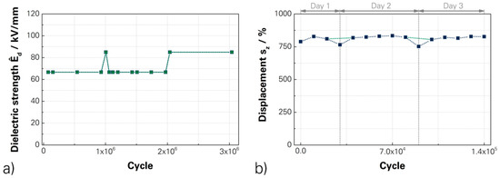 Investigated durability of the fully polymer DEAs for a (a) mechanical stress and cyclic measurement [15]; and (b) electro-mechanical stress under actuation conditions [15]—Table S1: actuators 10 and 11.