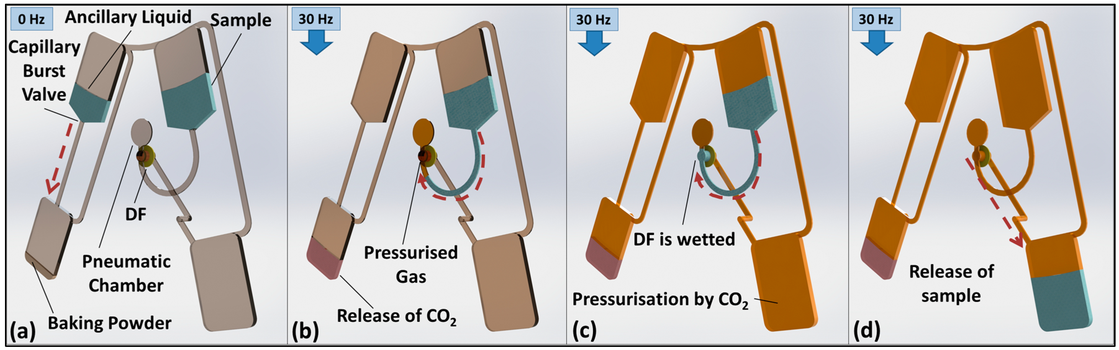 Basic valve operation. Note that the intensity of brown intensity indicates the gas pressure. (a) Liquid and baking powder are loaded, and the disc is sealed from the atmosphere using adhesive tape (not shown). In this pneumatically isolated fluidic network, the bypass channels prevent the establishment of uniform pressure. Only the gas pocket at the dissolvable film (DF) membrane is exposed to the hydrostatic pressure head of the upstream sample; (b) upon spinning, a capillary burst valve opens and the ancillary liquid reaches the baking powder; the emerging CO2 gas pressurises the network and thus compresses the gas pocket; (c) with increasing production of CO2, the sample protrudes into the pneumatic chamber and eventually wets the DF; and (d) DF dissolves to open the valve and release the sample.