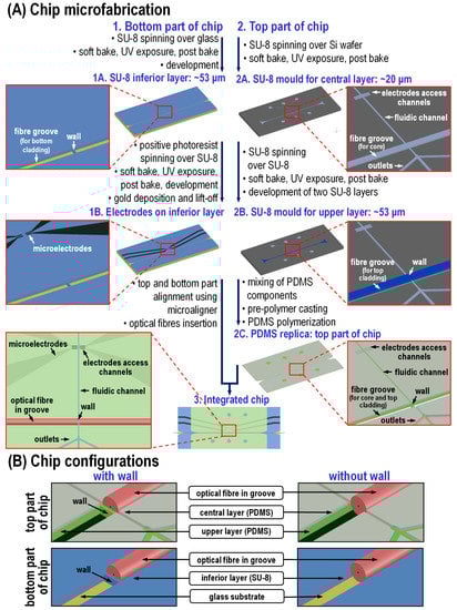 Construction details of the hybrid microfluidic chip: (A) microfabrication process (the bulk part of the PDMS is not shown so as not to darken the images) and (B) 3D schema of the optical detection area showing the configuration with the wall (left) and without the wall (right) in between the optical fibers (125 µm diameter) in the upper and inferior layers. The top part of the chip is placed upside-down on the bottom part of the chip forming a sandwich of a total fiber groove depth of 126 µm.