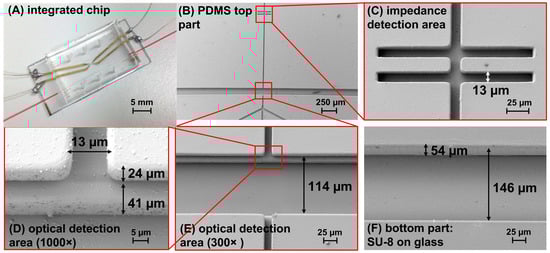 (A) Photography of a hybrid chip integrated with electrodes and optical fibers; (B–F) scanning electron micrographs of the components of the microfluidic chip showing the configuration without the wall in between the optical fibers: (B) top part of the chip fabricated in PDMS; (C) zoom-in showing the details of the impedance detection area; (D) optical detection area at magnification 1000× and (E) 300×; and (F) bottom part of the chip: SU-8 inferior layer on a glass substrate.