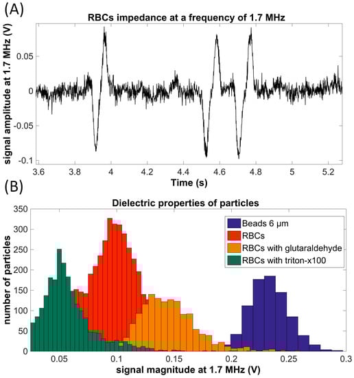 (A) Results obtained by passing red blood cells (RBCs) in the electrical characterization area at 1.7 MHz; (B) histogram of signal voltage magnitudes obtained by passages of different particles: 6-μm beads, RBCs, RBCs fixed with glutaraldehyde and RBCs fixed with triton.