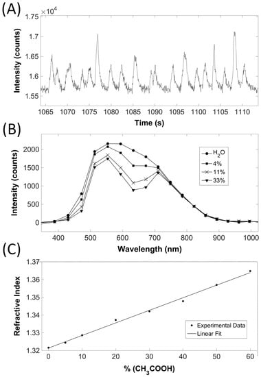 Optical characterization results obtained by the developed platform (see Figure 1E for the setup diagram): (A) counting of fluorescence beads (intensity corresponds to the sum of the detected charged-coupled device (CCD) counts over a 5-nm interval around the spectral emission peak at 582 nm); (B) absorption spectra of various malachite green-dyed solutions (each spectra corresponds to approximately 4000 data points with an associated uncertainty of ±2 counts); and (C) refractive index variation as a function of acetic acid concentration (each data point has an associated maximum uncertainty of 10−4 refractive index units).