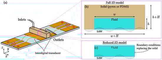 In the following, we present our results for the numerical simulations of the acoustic fields in the reduced and full models with SAW actuation, and we compare the two cases. As the microchannels are long and straight along the x-direction, we assume translational invariance along x and restrict the calculational domain to the two-dimensional (2D) cross section in the plane. The full model consists of coupled fluid and solid domains, whereas the reduced model consists of a single fluid domain with boundary conditions that in an approximate manner represent the walls. The principle of our model approach is illustrated in Figure 1, while the models are described in detail in Section 4.