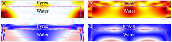 We consider first the full model of a pyrex microdevice, in which a rectangular water-filled channel of width w and height h is encased by a pyrex wall of height and width (see Figure 1b). We simulate the case of actuating the system both at the horizontal standing half-wave resonance in the water often exploited in experiments, and at the off-resonance frequency chosen to facilitate comparisons with the literature [36]. An example of a full-model result for the velocity field and relative volume change in the pyrex as well as and in the water, is shown in Figure 2a,c.