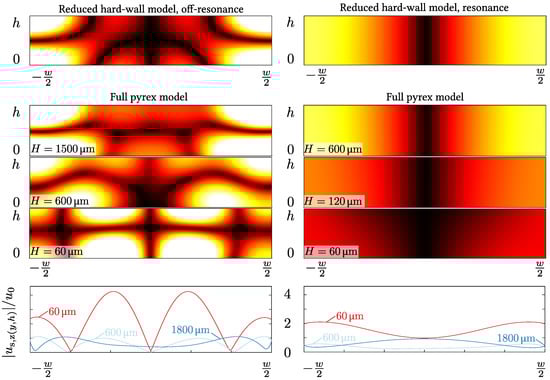 We then investigate to which extent the full model can be approximated by the reduced hard-wall model often used in the literature [29,38], where only the water domain is considered, while the pyrex walls are represented by the hard-wall condition. In Figure 3, we show for both off-resonance (left column) and on-resonance (right column) actuation, a qualitative comparison between the reduced and the full model, with wall thickness H ranging from 60 to 1800 m. Considering the resulting amplitudes of first-order pressure field in the water domain, we note that, for off-resonance actuation at the frequency , the full model with thick walls has some features in common with the reduced model.