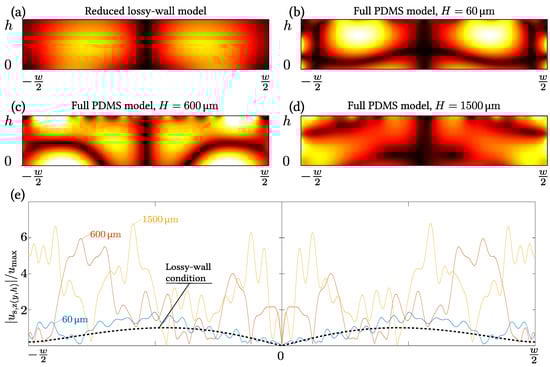 The poor qualitative agreement between the pressure field in the reduced lossy-wall model and in the full PDMS model is further supported in Figure 4e, where the upper-wall displacement amplitudes of the models are shown. We introduce the unit as the maximum displacement along the upper-wall in the reduced lossy-wall model, and note that the lossy-wall condition imposes a broad single-node sinusoidal velocity amplitude of unity magnitude, while each of the four full model cases (, 600, and 1500 ) shows a rippled, multi-peaked displacement amplitude of relative magnitudes ranging from 2 to 6. The ripples are caused by the small wavelength (15 ) of the transverse waves in PDMS at the given frequency (see Table 1).