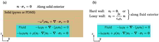 In total, four models are set up, all with the imposed SAW as a boundary condition representing the actual piezoelectric lithium niobate substrate: (1) the full pyrex model, Figure 5a, where the solid wall is modeled as a linearly elastic material with the parameters of pyrex, while the fluid is modeled as water; (2) the reduced hard-wall model, Figure 5b, where only the water is modeled, while hard-wall boundary conditions replace the pyrex wall; (3) the full PDMS model, Figure 5a, which is the full pyrex model in which the pyrex parameters are replaced by PDMS parameters; and (4) the reduced hard-wall model, Figure 5b, where only the water is modeled, while lossy-wall boundary conditions replace the PDMS wall.
