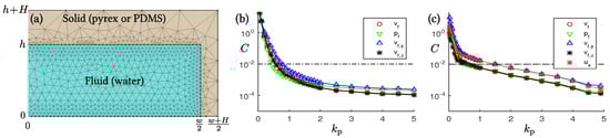 (a) The mesh implemented in COMSOL 5.2 (COMSOL, Stockholm, Sweden), here shown in a coarse version for illustrative purposes with the small value = 0.1 for the mesh parameter; (b) For each of the fields , , , and , the relative mesh convergence parameter C is plotted versus mesh parameter for the reduced lossy-wall model. The dashed line represents ; (c) The same as in (b) but for the water domain in the full PDMS model with the inclusion of the field .