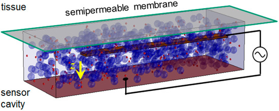 Scheme of affinity sensor microelectromechanical system (MEMS) with reversible binding receptors (small red spheres) and polymers of the analyte (large blue spheres). Analyte molecules (not shown) can pass freely through the semipermeable membrane between tissue and sensor cavity, where they modulate the bonding pattern within the macromolecular network. The state of viscosity is determined by the movement of a bendable beam that is electrically attracted to the ground plate (yellow arrow).