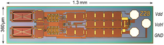 The space above the MEMS is filled with the assay and is separated from the body tissue by a semipermeable membrane being permeable for low-molecular-weight metabolites, but not for dextran and ConA. A cross-linking network of macromolecules with varying viscosity is formed in the assay, the degree of which depends on cg. The measurement is not performed in a vessel of the blood circulation, but in the interstitial tissue, where the implant will be situated. The sensor chip is operated by a DC voltage Vdd between 2.5 V and 3.3 V, which is converted to a 3.2-GHz HF voltage in a ring oscillator circuit. The frequency f0 is chosen to lie between the absorption maxima of proteins and water in protein–water solutions. It is far above any mechanical resonance frequency of the MEMS beam, making it operate in the aperiodic damping regime. There are two MEMS active on the sensor chip that disposes of a deflective and an unbendable beam representing the measuring MEMS and the reference MEMS, respectively [15]. The frequency of the first changes during the measurement, which is followed by a phase-frequency detector (PFD). The time it takes for the beam to deflect to a defined position is taken as a measure for the viscosity of the assay and, therefrom, for the glucose concentration. A chip photo is displayed in Figure 2.