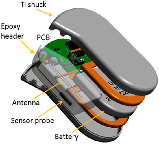 Explosion scheme of biosensor implant in a Ti/epoxy housing.