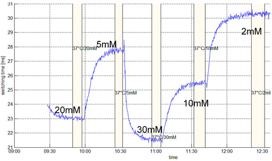 Calibration measurement for determining the switching time tsw in dependence of glucose concentrations cg, i.e., 20, 5, 30, 10, and 2 mM of glucose, respectively, in standard electrolyte.