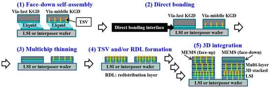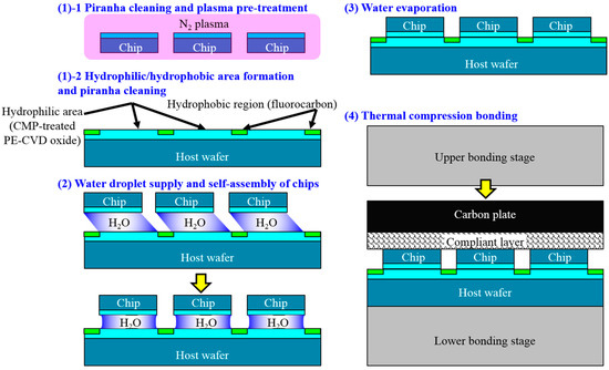 As is also mentioned in the paper, a known good dies (KGDs) array can be simultaneously and precisely self-assembled on a host wafer by liquid surface tension as a driving force [7,11,12,13]. This methodology can solve a potential tradeoff issue between assembly throughput and assembly accuracies in one-by-one pick-and-place assembly used in conventional chip-to-chip, chip-to-wafer, and chip-to-substrate approaches. Thus, the MCtW integration with the use of KGDs would be expected for advanced packaging including multi-layer chip stacking [14].