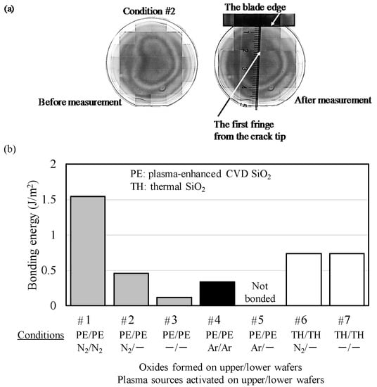 On the other hand, the wafers bonded through the thermal oxide layers under the conditions #6 and #7 show quite larger bonding energies than those through the PE-CVD oxide layers under the conditions #2 and #3. The bonding energy of #7 (non-activated thermal oxide bonding) is slightly higher than that in previous direct bonding works [31,33]. However, the bonding energy of #6, thermal oxide bonding activated on one wafer, seems to be approximately half of that reported in the previous work [31]. There is the possibility that the low bonding energies obtained from plasma-activated thermally oxidized wafers bonding in this work are due to the N2 conditions such as plasma power, activation time, and/or organic contamination from the sputtering equipment used in this plasma activation process. Since the quick blade insertion in this work has been carried out at high humidity atmosphere although the bonding energy measurement has been done within 5 min directly after the blade stop, the resulting bonding energies could show lower values due to external water stress corrosion during the DCB measurement [34], especially for low-power deposited PE-CVD oxides sensitive to moisture [38].