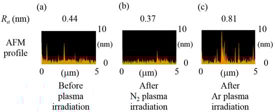 AFM profiles and surface roughness before (a) and after plasma irradiation (b,c) on the surface of CMP-treated PE-CVD oxide.