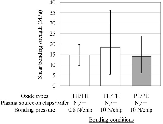 Figure 5b shows the shear bonding strengths of the directly bonded chips using the three types of surface treatments. The strongest average shear bonding strength was 19.5 MPa, and was obtained with both the surface treatment of plasma activation and water dipping. The surface treatments with plasma activation exhibited average direct bonding strengths of 6.8 MPa, whereas the water dipping treatment exhibited 13.1 MPa. These results indicate that the wafer surface pre-treatment by water dipping makes a strong contribution to the achievement of the high bonding strengths for the MCtW direct bonding processes, compared to N2 plasma irradiation. As seen from Figure 5a,b, water absorption on the surface and/or subsurface [31] of the host wafers would act as a dominant factor to obtain both high bonding strengths and high bonding uniformity on the entire surface of the chips.