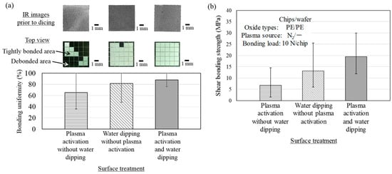 Bonding uniformity of chips directly bonded to wafers conditioned with different surface treatments (a). The IR images of chips are taken after MCtW direct bonding prior to dicing and the top views show a whole chip after dicing. The error bars indicate the max. and min. ratio of “the number of non-debonded 1-mm-square small dielets per a 5-mm-square chip” to “25 (the total number of the small dielets after dicing per the chip)”. Shear bonding strengths of chips directly bonded to wafers conditioned with different surface treatments (b).