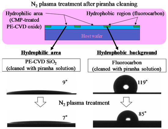 The effects of N2 plasma irradiation and water dipping on MCtW direct bonding are characterized in this session. Therefore, most papers have discussed oxide-oxide bonding with thermally oxidized Si wafers and/or bare Si wafers in detail [30,31,44,45]. A few papers have described the detailed mechanism of direct bonding through CVD oxide [34,38].