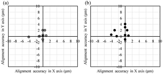 In the “non-transfer stacking” scheme, plasma activation is applied only on chips to be self-assembled because the N2 plasma treatment decreases the hydrophobicity of the regions surrounding the assembly areas. The water contact angle is reduced from 119° to 85° after N2 plasma activation, as shown in Figure 6. When the low hydrophobic surrounding region is employed for self-assembly, the alignment accuracies are significantly decreased. Therefore, plasma activation is applied only on the surface of chips prior to self-assembly. The chips with CMP-treated PE-CVD oxide are self-assembled upside down to the host wafer. As shown in Figure 7a, almost all the chips exhibit high alignment accuracies within approximately 2 µm even when these chip are manually positioned at the release point higher than the surface of the droplets by 1 mm or more with coarse X/Y/θ pre-alignment. The average alignment accuracies of all self-assembled chips before direct bonding are −0.36 µm and 0.27 µm with a standard deviation of 1.46 µm and 1.10 µm in x and y directions, respectively. These accuracies include systematic errors caused by wafer tilt and xy sift in photolithography processes to define the size of chips and assembly areas. The size shrinkage of chips used in this study were within 2 µm that was resulted from the excess side etching under the plasma dicing conditions for fabricating thick chips with a thickness of 0.28 mm. In addition, the outer size patterns of the 5-mm-square chips and micro-vernier patterns formed on the chips to evaluate self-alignment accuracies were determined by a mask aligner that empirically gives alignment error of ±2 µm at most. However, misalignment of photomasks generally includes not only xy errors but also theta error, and thus, the potential maximum self-assembly error cannot be precisely defined. On the other hand, the average alignment accuracies and standard deviations with absolute numbers in x/y directions are 0.73 µm /0.76 µm and 1.29 µm /0.80 µm for all self-assembled chips before direct bonding, respectively. The relatively large statistics are explained by the local minimum energies that are present in this capillary chip self-assembly system. Ideally, a chip would be positioned to the center of the host hydrophilic assembly area by self-assembly, otherwise the chip would be positioned to the edges of the hydrophilic area. On the way to final positioning in self-assembly processes, the chips are often fixed due to the chip own weight against restoring forces driven by water surface tension and/or friction force from host wafers (hydrophobic surfaces) due to the chip tilt. The big statistics is also mainly attributed to the manual chip handling (not well controlled chip pre-positioning), giving large initial offsets in x/y/z/θ directions in addition to chip tilt prior to chip landing onto the top of the water droplets immediately after chip release [40,41,42,43]. We can further increase the alignment accuracies and reduce the variation by chip thickness reduction down to 100 μm or below, by the use of automatic/robotic chip handling systems, and by optimization of lithographic conditions using steppers to define the vernier positions toward outer sizes of the corresponding hydrophilic assembly areas.