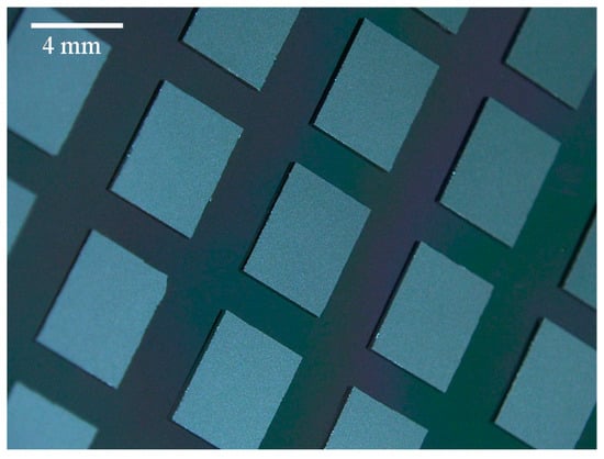 The following oxide-oxide direct bonding is curried out with the EV520 bonder to provide thermal compression through the flexible graphite sheet used as a TTV absorber for uniform compression of the self-assembled chips on the host wafers. As shown in Figure 8, these chips are precisely aligned and bonded on wafer when the high hydrophobic surrounding region are employed. Finally, these chips are annealed at 300 °C in vacuum under 5 Pa with a bonding load of 10 N/chip. Prior to the thermal compression process, the self-assembled chips are not tightly bonded on the wafer through Van der Waals interaction between the oxide surface and water used as a self-assembly mediate. As shown in Figure 7b, the alignment accuracies are slightly degraded due to the chip shift by the compressive force. The average alignment accuracies of all self-assembled chips after direct bonding in x and y directions are 1.22 and 1.46 µm with a standard deviation of 1.78 and 1.61 µm, respectively. The slight chip shift by thermal compression would be restricted by transfer-stacking based MCtW 3D integration with SAE carrier technologies in which self-assembled KGDs are temporarily fixed by electrostatic adhesion [28]. The yields of successful chip bonding are nearly 100% when we use 10 N/chip in bonding load. The resulting shear bonding strengths are 16.0 MPa on average for the CMP-treated chips conditioned with plasma activation and water dipping treatments. It is said that the effect of water dipping is much higher than that of plasma activation. These bonding strengths are sufficiently high enough to allow backside grinding and Si-CMP during multichip thinning.