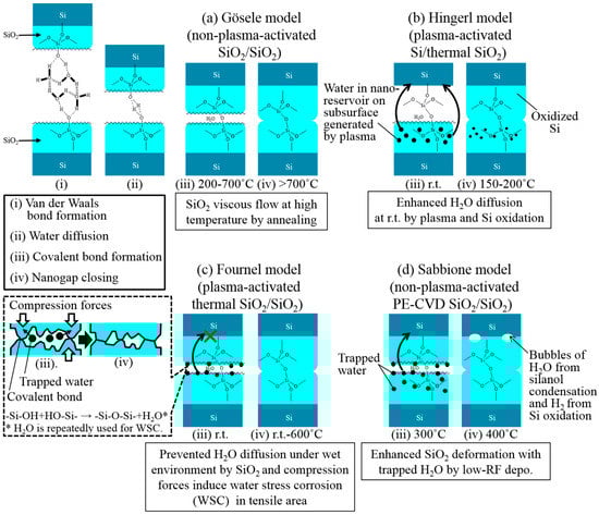 Four models of Si/SiO2 and SiO2/SiO2 direct wafer bonding.