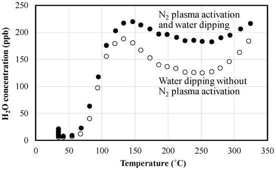 In this work, to analyze the mechanism of plasma-assisted oxide-oxide direct bonding with a water dipping process, the water storage properties of CMP-treated PE-CVD SiO2 surfaces with and without N2 plasma irradiation were quantitatively measured with an APIMS. APIMS enables us to know the quite small amount of vaporized H2O molecules desorbed from wafer surfaces at atmospheric pressure [46]. Compared with thermal desorption spectroscopy (TDS), APIMS can precisely detect H2O concentrations because almost all H2O molecules are desorbed from the surface of the wafers prior to measurement at a desired temperature region under the high-vacuum conditions of TDS. For the APIMS measurement, 0.28-mm thick Si wafers with a PE-CVD SiO2 layer were prepared. The wafers were treated with/without N2 plasma, and then, dipped into deionized water and subsequently spin-dried. After that, the wafers were set into an APIMS system and H2O concentrations were detected. Figure 10 shows the water storage properties on the PE-CVD SiO2 treated with/without N2 plasma. In the figure, the x- and y-axis indicate measurement time and H2O concentrations. 2498 ng of H2O molecules were detected with a non-activated wafer with PE-CVD oxide, whereas 3304 ng of H2O molecules were detected with the plasma-activated wafer with the oxide layer. As seen from these results, approximately 1.3-fold H2O molecules are stored on/in the PE-CVD SiO2 treated with N2 plasma, compared with that without the plasma treatment. The water molecules stored on the surface of the PE-CVD SiO2 layer are dramatically increased at above 70 °C. These results show that plasma activation is effective to obtain high-water-content surfaces. It can be said that the amount of absorbed water molecules on the surface of the oxide is increased by the plasma activation. There is also the possibility that the nano-reservoirs generated by the plasma irradiation process could contribute to the water storage property of SiO2 surfaces as described by Hingerl et al. [31]. As reported by Fournel et al. [34], however, if water stress corrosion is happened at the plasma-activated PE-CVD SiO2/SiO2 interface, the high bonding energy under the condition #1 against #3 listed in Figure 2 is good agreement with their model dealing with internal water stress corrosion that induces high bonding energies. On the other hand, Sabbione et al. [38] have expatiated on the PECVD oxide-oxide direct bonding in which absorbed water in the oxide reduces the hardness as a mechanical property, leading to an increase in local bonding area due to the enhanced elastic deformation. In addition, low RF power of the PE-CVD oxide deposition gives a decrease in the modulus and hardness as well. They also have demonstrated that the absorbed water diffuses through a 400-nm-thick PE-CVD oxide and reaches Si bulk, followed by oxidation at 400 °C although plasma activation is not employed. Considering these previous works, it will be noted that water molecules play a crucial role for oxide-oxide direct bonding. As seen from the results obtained under the conditions #1 and #3 in Figure 2, our thermocompression oxide-oxide bonding would be affected by the internal water stress corrosion. In this study, it is not clear whether the silanol condensation and oxidation reactions are occurred at the Si/SiO2 interface as shown in Figure 9d. However, our oxide-oxide thermocompression direct bonding is actually enhanced by “water” trapped on the surface (and/or subsurface) of and the inside of the PE-CVD oxide deposited at relatively lower RF. As seen from the APIMS analysis of the plasma-activated PE-CVD oxide, the water uptake quantity is undoubtedly high. As is also seen from the AMF profiles in Figure 3a,b, the asperity summits must be reduced by the plasma treatment. The elastic deformation of our PE-CVD oxides would be supported by the thermocompression bonding although Sabbione et al. have described small difference in bonding energy between thermocompression and load-free simple annealing [38]. The other parameters such as CMP/cleaning conditions, internal stress, the amount of Si–OH content on the surface of CMP-treated PE-CVD oxides, and the deposition temperature would impact on the thermocompression direct bonding energies. For these reasons, a comprehensive understanding of oxide-oxide bonding mechanisms warrants separate studies on PE-CVD chemistries.