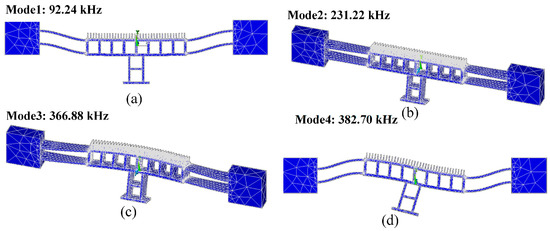 The first four modes of design B: (a) The first mode in-plane at 92.24 kHz; (b) The second mode out-of-plane at 231.22 kHz; (c) the third mode out-of-plane at 366.88 kHz; while (d) The fourth mode in-plane at 382.70 kHz.