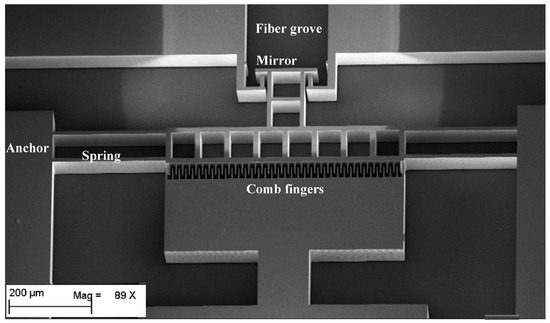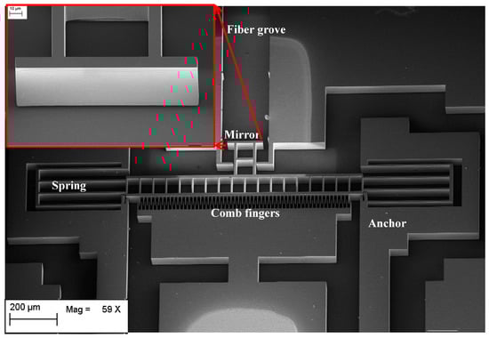The MEMS devices were fabricated using deep reactive ion etching (DRIE) technology on an SOI wafer in a monolithically integrated manner. The device layer height of the SOI is 80 µm and the buried oxide (BOX) layer thickness is 3 µm. Figure 7 shows the main fabrication steps. The movable parts are released by etching the oxide layer underneath the structures using vapor HF etching of the SiO2. Fiber groove are used to guide the fiber inside the optical MEMS chip in a self-aligned manner. The MEMS actuators are driving a micromirror that is used for the opto-mechanical characterization of the devices making use of an optical cavity between the mirror and the optical fiber surfaces. The scanning electron microscope images of the fabricated structures are shown in Figure 8 and Figure 9. To minimize the surface roughness, post-etching smoothing of the optical surfaces is applied to produce a micromirror with high surface quality. The optical surface was obtained with a sidewall angle whose deviation from the perfect verticality is smaller than 0.1°. The peak-to-peak surface roughness of the micromirror is in the order of 60 nm. The micromirror surface is shown in the insert of Figure 8.