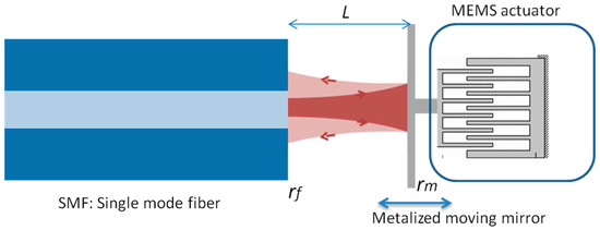 Schematic representation of the fiber Fabry-Perot interferometer with metalized moving mirror connected to MEMS actuator.