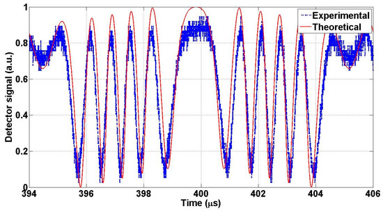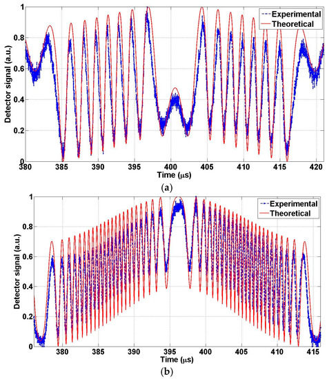 The objective of this test is to determine the maximum mechanical FTR of the actuator when operated at a given frequency and finding the maximum product of the FTR and the frequency at resonance. Actuator A was connected using the setup shown in Figure 12. Figure 13a depicts the experimental interferogram recorded due to the motion of the MEMS mirror in front of the fiber. The applied voltage for this test was recorded to be 36 V DC and 9.5 V AC at a fixed frequency of 26.06 kHz. The results are fitted to the theoretical predictions. Figure 13 shows the effect of diffraction. As discussed in Section 5.1, the signal intensity is different for opposite directions around the rest position. The difference in the contrast of the interferogram between theoretical and experimental may be due to misalignment due to the fiber cleaving angle. The peak-to-peak displacement, maxima to maxima or minima to minima, travelled by the actuator can be roughly estimated by fringe counting as given by:
