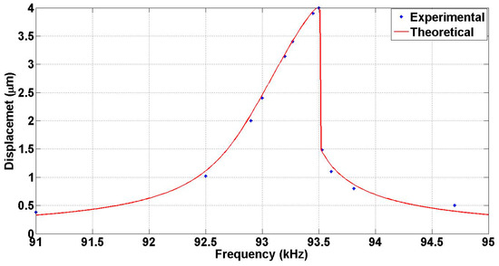 The resonance frequency of design B was measured by sweeping the frequency from 91 to 94.6 kHz at DC and AC voltages of 150 and 10 V respectively. It is found to be 93.50 kHz, as shown in Figure 16, in good agreement with the simulation results presented in Section 3. The quality factor is then determined from Figure 16 by fitting the experimental data to the theoretical prediction in the presence of non-linearity and was found to be 282.