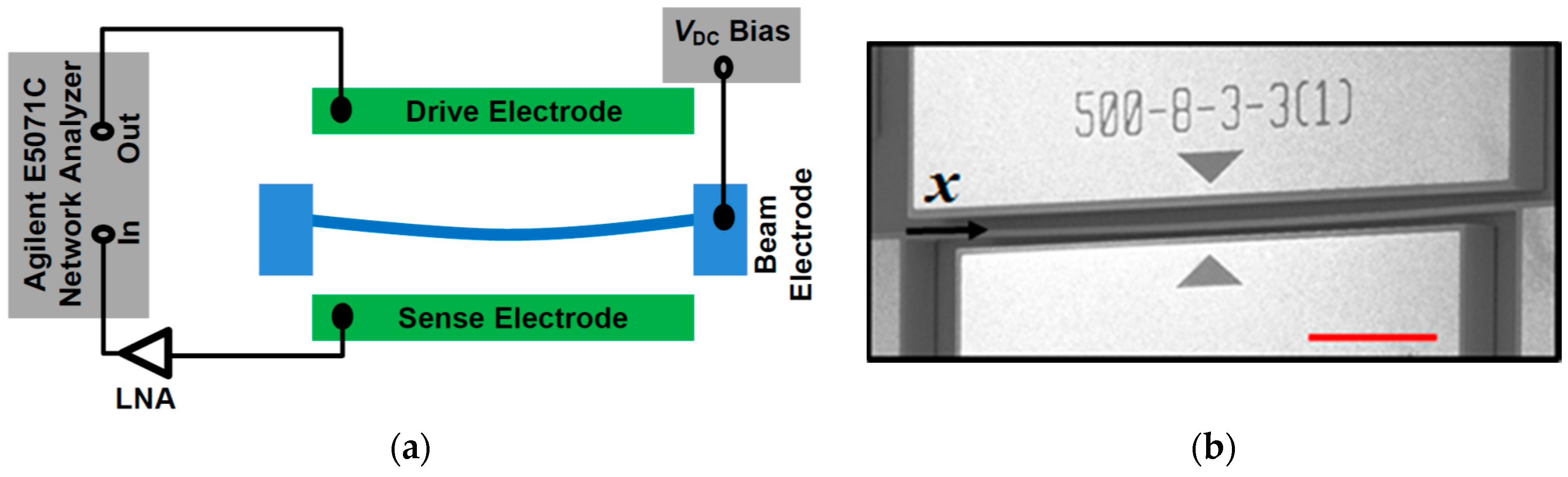 Figure 1a shows the block diagram of the two-port electrical transmission measurement configuration for electrostatic actuation and sensing. The drive electrode is provided with an AC signal from the network analyser (Agilent E5071C, Keysight Technologies, Santa Rosa, CA, USA) and the beam electrode is biased with a DC voltage source, which is also used to modulate the nonlinear resonance. The output current induced at the sense electrode is coupled with a low noise amplifier (LNA) whose output is connected to the network analyser input port. Figure 1b shows an scanning electron microscope (SEM) image of the fabricated clamped–clamped arch beam.