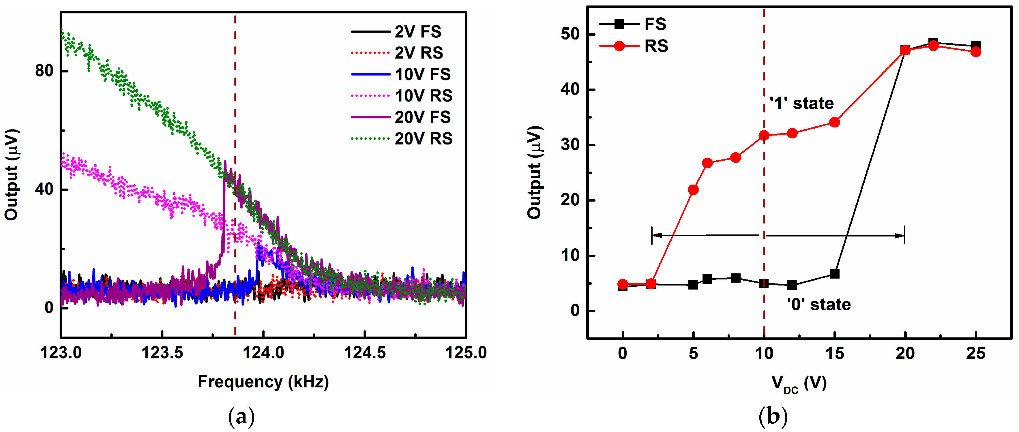(a) Experimentally obtained frequency–response curves at different applied DC bias voltages while alternating current (AC) voltage is fixed at −5 dBm (0.125 Vrms). Forward and backward sweeps (FS/BS) were performed to observe the frequency hysteresis cycle. Forward sweeps for all DC bias voltages are shown in solid lines, whereas the backward sweep curves are shown in dotted lines; (b) Response of the resonator with respect to the DC bias voltage at a fixed frequency (123.863 kHz) and fixed AC voltage (−5 dBm). The response shows a hysteretic behavior when the DC bias voltage is swept in forward (black line with square symbols) and backward directions (red line with circle symbols). The chosen operating point at 10 V, which has two states (“1” or “0”), and can be set or reset to memory states by momentarily increasing or decreasing the DC bias voltage, respectively.