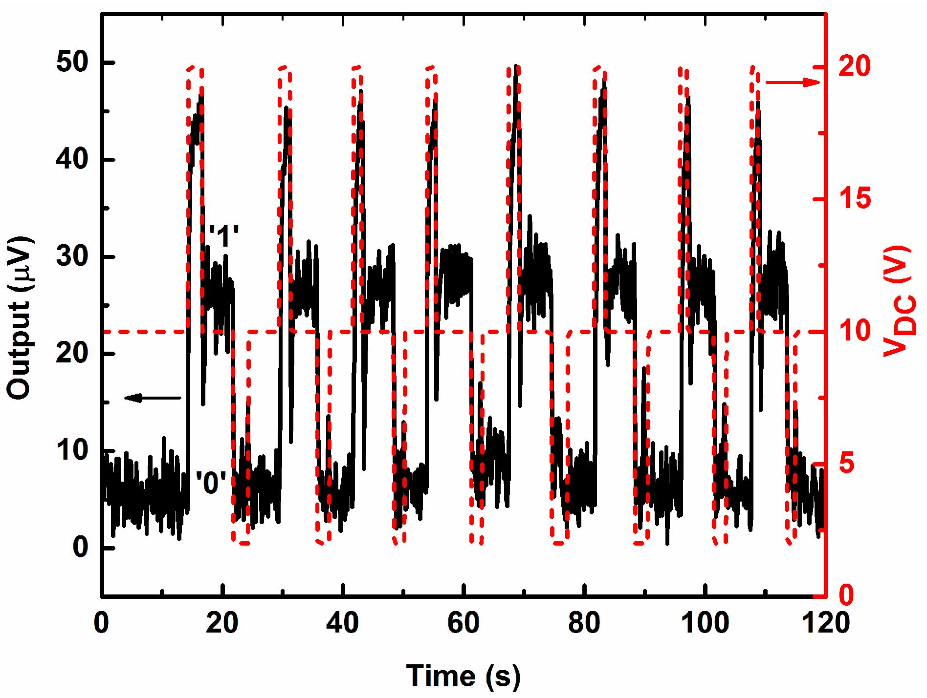 The sequential operation of the memory device. The black line represents the memory states (“1” or “0”). The red dashed line represents the waveform of the DC bias voltage used as write signal.