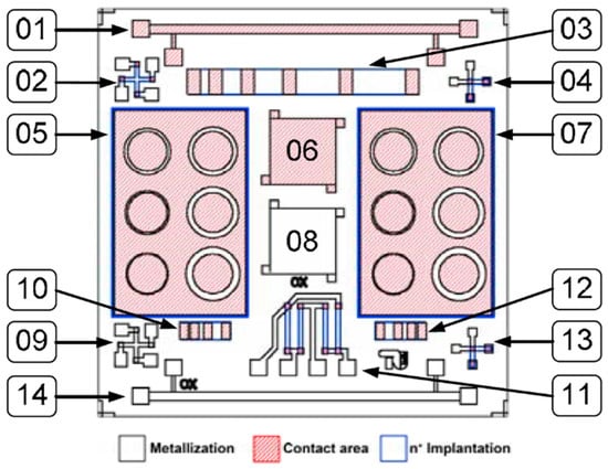 Figure 1. There are two bone structures and two square van-der-Pauw structures. The upper van-der-Pauw structures are designed so that the metallization is in contact with the substrate. Those can be used to characterize the metallization in contact with the SiC substrate. In the lower structures, the metallization is insulated from semiconductor substrate, so that structures can be used to measure the metallization’s sheet resistance without influence of the subjacent substrate. The upper Greek cross structure can be used to determine the semiconductor sheet resistance, while the lower one can be used to determine the sheet resistance of the metallization stack. The layout consists of four implanted resistors and mimics a Wheatstone-bridge measurement circuit, as is normally used in sensor devices. Three linear transmission-line matrix (TLM) test structures, two circular TLM structures, and two cross-bridge Kelvin resistor structures have been used for measuring the specific contact resistivity. In addition, the I–V characteristics of the metal semiconductor contact can be measured using the contact pads of the linear TLM structure. The I–V curve indicates whether an ohmic contact has been formed, and changes in the curve’s slope indicate changes in the metallization’s sheet resistance or contact resistivity.