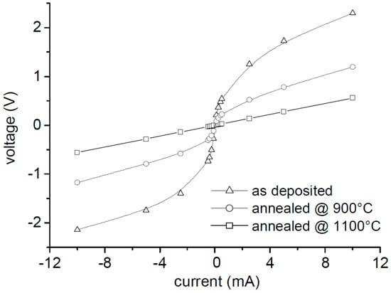 The I–V curves of the samples, annealed at different temperatures, are depicted in