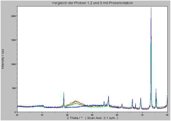 The broad peak at 2θ = 43° is indicative of an amorphous layer. No crystalline compounds were found in the deposited layers. All peaks originate from the Si substrate. This composition is thermally stable at temperatures up to 500 °C. This is in agreement with the literature [