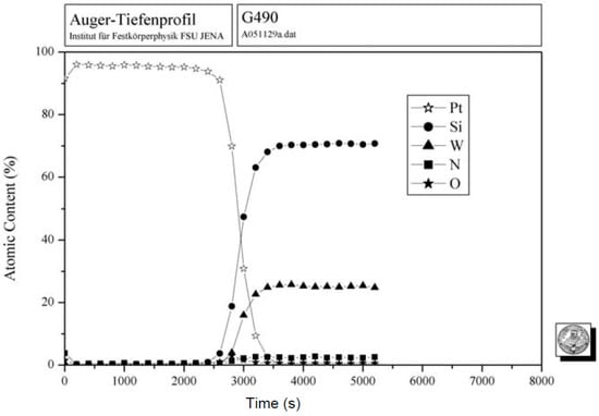 For our experiments, unpatterned 4 inch (100)-Si wafers (n-type, phosphorous, 1–10 Ω·cm) were used as substrate material. The substrates were oxidized by dry thermal oxidation at 1000 °C in O2 ambience to create 100 nm of SiO2. WSi2 contact layers with a thickness of 200 nm were sputter-deposited in a Leybold Heraeus Z660 Load Lock Sputtering System (Leybold GmbH, Cologne, Germany) from a high purity WSi2.3 composite target. The thin films were DC magnetron-sputtered at 1.5 kW forward power using krypton gas at a pressure of 5 × 10−3 mbar. A rapid thermal processing system Xerion Xreact 1000 was then used to anneal the samples for 1 min at 1000 °C in a high purity argon flow. W–Si–N barrier layers with a thickness of 200 nm were deposited by reactive sputtering using the same WSi2.3 target as that of the contact layers. Barrier layers with three different compositions were direct current (DC) magnetron-sputtered at 1.0 kW forward power using gas mixtures of 10 sccm N2 + 80 sccm Ar, 5 sccm N2 + 85 sccm Ar, and 2 sccm N2 + 88 sccm Ar, respectively. Finally, 150 nm of platinum were sputter-deposited at room temperature.