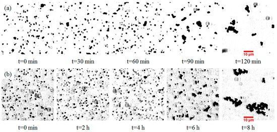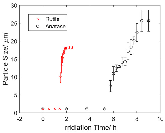 The aggregation of TiO2 submicron particles was investigated through visualization using an optical microscope. Prior to the application of UV light, both rutile and anatase suspensions were kept in a dark environment for 10 h to ensure minimum aggregation. Figure 1 shows the changes of rutile (Figure 1a) and anatase suspensions (Figure 1b) under UV light over different time periods. It was observed that the aggregation rate of rutile particles was much faster than that of anatase particles. A quantified version of aggregation that shows the changes of particle sizes over time is illustrated in Figure 2. Both rutile and anatase suspensions went through a slow start-up and then a rapid increase in terms of particle size during aggregation. It was illustrated that the rutile particles coagulated significantly faster starting from about 1.5 h, with an average growing rate of 1.23 µm/s in diameter, until their average sizes peaked at 2 h. After this time, no further aggregation was clearly observed and the ultimate average particle diameter remained around 18.15 µm. In comparison, the accumulation of anatase particles in the suspension showed a similar trend but in a much slower process. The rapid growth of anatase particles started at 5.75 h and plateaued at 8.4 h. During that period, the average growing rate was 0.22 µm/s in diameter and the ultimate average particle size was around 25.7 µm.