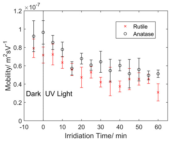 The electrostatic movement of TiO2 particles due to the surface potential exhibited the same variance with the measured mobility depending on the irradiation time, as shown in Figure 3. The mobility of both rutile and anatase immediately decreased upon application of UV light. During the first 15 min, the effect was remarkable, with a decrease of 2.32 × 10−8 m2·s/V for rutile and 3.51 × 10−8 m2·s/V for anatase. Over 1 h of UV irradiation, the overall magnitude decrease of mobility for rutile and anatase was about 60.8% and 46.4%, respectively. Rutile exhibited a lower mobility than anatase with an average difference of 1.37 × 10−8 m2·s/V throughout the test. This corresponded to a lower Zeta potential of 12.1 mV based on Equations (1) and (2), and indicated a lower surface charge, and thus faster aggregation rate for rutile particles.