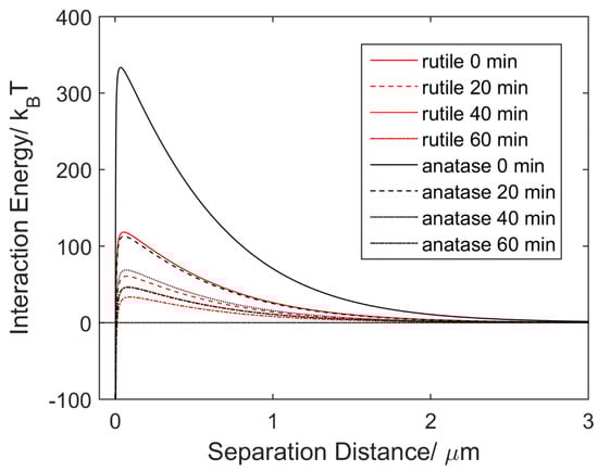 The DLVO theoretical model was applied to quantitatively investigate the aggregation behaviors of rutile and anatase particles and the results are shown in Figure 4. The EDL repulsive force is determined by the particle surface charge. The initial Zeta potential of anatase was set to −30 mV in DI water (pH ≈ 6.5) as a reference point [17]. From the difference of measured mobility shown in Figure 3, the initial Zeta potential of rutile was calculated as −18.3 mV based on Equations (1) and (2). After 20, 40 and 60 min of UV irradiation, the Zeta potentials of rutile and anatase were reduced to −13.4, −11.9, −10.2 mV and −17.9, −14.2, −11.8 mV, respectively, according to the decrease of the particle mobility.