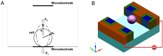 As the mechanical properties can reveal some important information regarding the fusion process, such as the membrane protein structure, and potential applications in cell separation or tumor cell detection based on the mechanical properties, several well-known tools have been used to measure the mechanical properties of cells, including optical tweezers [9,10,11], micropipette aspiration (MPA) [12], atomic force microscopy (AFM) [13], and electro-deformation (ED) [14,15,16,17,18]. Among these methods, ED is more amenable to lab-on-a-chip implementation and does not require complicated equipment. When biological cells are in a nonuniform electric alternating current (AC) field, Maxwell–Wagner polarization occurs, resulting in dielectrophoresis (DEP), electrorotation (ER), and electro-deformation. DEP can be used to trap cells in a non-uniform electric field. With an increase in the strength of the electric field, cells can be stretched, which is called electro-deformation [19].