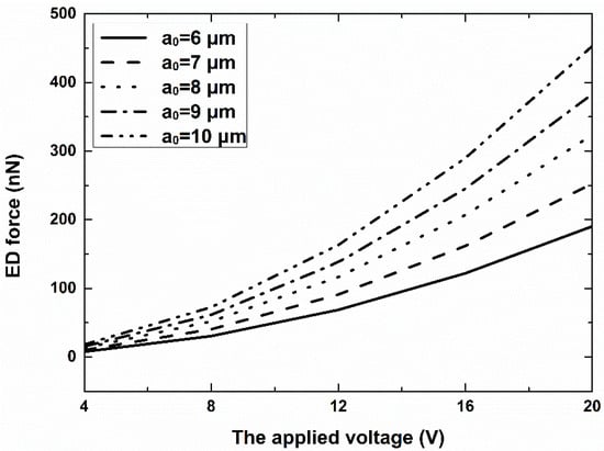 Electro-deformation (ED) forces as a function of the applied voltage and radius of the cell. The applied frequency was 1 MHz.