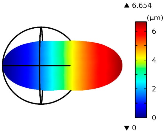 As the electric properties of cells are mostly unknown, we used common values. As shown in Figure 2, as the applied voltage increased from 4 V to 20 V, the electrodeformation force changed from 7.6 nN to 190.4 nN for a cell with = 6 μm. Larger cells experience a larger electro-deformation force, but larger cells also require a large force to deform. Figure 3 depicts an example of the deformation of a cell with radius = 6 μm under 16 V of AC voltage when the Young’s modulus of the cell is 600 Pa. The color represents the displacement along the x axis. The deformation ratio is ~1.555.