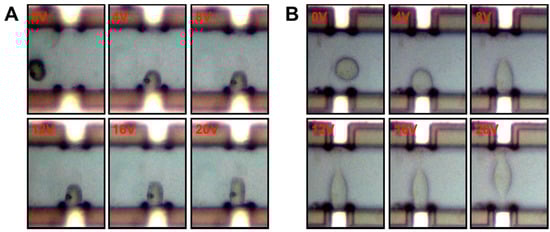 When subjected to electric fields, both the fused and unfused stem cells showed deformation parallel to the applied electric field lines, as shown in Figure 4. With the increase in applied voltage, the deformation degree also increased. When the applied voltage was significantly high, some cells could be very deformed and cross the middle of the microchannel, or even move to the opposite microelectrode.