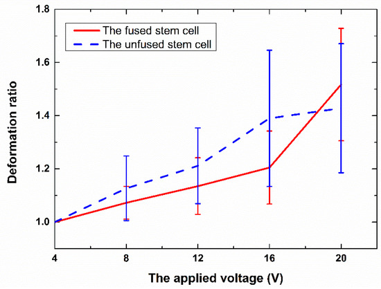 The deformation ratio vs. the applied voltage for the fused and unfused stem cells.