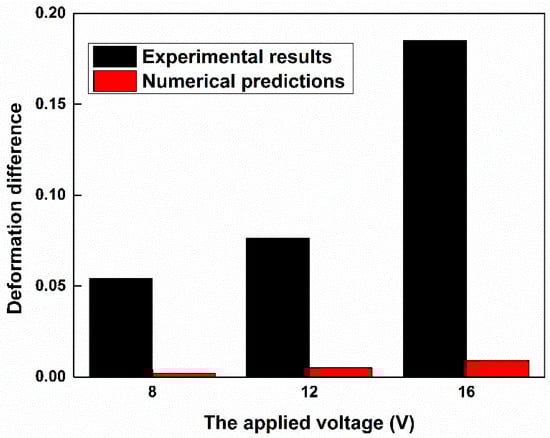 To compare with the experimental results, we assumed that the parameters of the cell membrane and cytoplasm were kept the same, and the same electric parameters of the fused and unfused cells were used in the simulation, except that the radius of the unfused stem cell was assumed to be 7.55 μm and the radius of the fused stem cell was assumed to be 8.88 μm. Note that a Young’s modulus of 1500 Pa was used to approximate the deformation ratio of the fused cell. Under the same conditions (16 V), the deformation ratio of the fused stem cell is approximately 1.212, which is smaller than that of the unfused stem cell (~1.221). The deformation difference is then 0.009, but from the experimental results, the deformation difference is ~0.185. Thus, compared to the experimental results, this deformation difference was due to the radius not being large enough to cause a significant difference to the deformation ratio of the fused and unfused cells (Figure 6). It could be concluded that compared to the unfused stem cell, not only was the radius of the fused stem cell changed, but also—and more importantly—the properties of the cell membrane were changed after fusion.