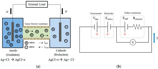(a) Schematic illustration of the RED process in the cation-selective channel; and (b) the equivalent electrical circuit of the experimental setup.